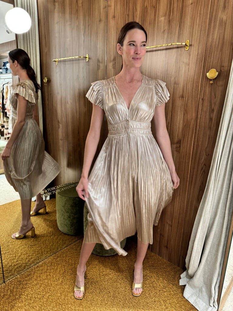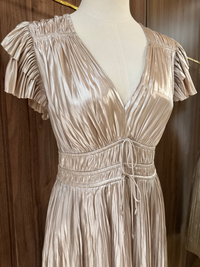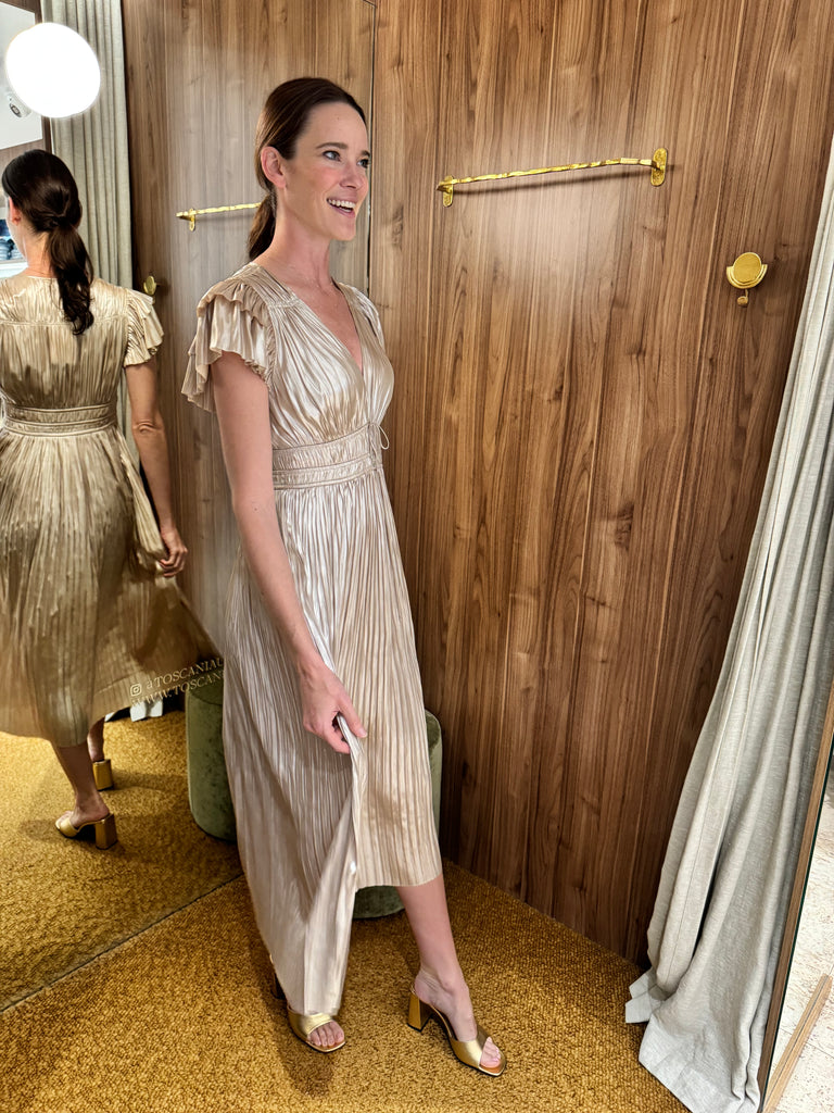 - Ulla Johnson "Patrice" dress exudes romance with its pleated fabric and tiered flutter sleeves